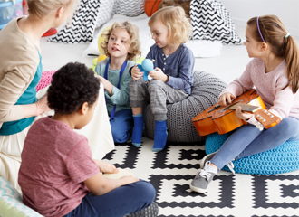 Explore music with rhythm, singing, and instruments to develop listening skills.